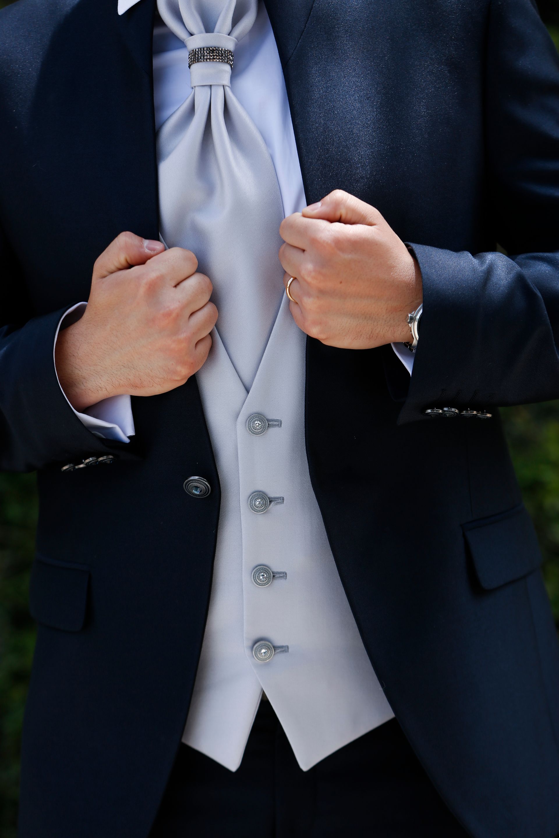 - MEZZO TIGHT: Il gilet, mono o doppiopetto, in raso grigio chiaro, anche se il colore tradizionale è beige tendente al giallo. Si indossa con camicia bianca e plastron o cravatta (vedi paragrafi camicie e cravatte) di seta grigi, niente cilindro, niente guanti e la giacca rigorosamente senza code.