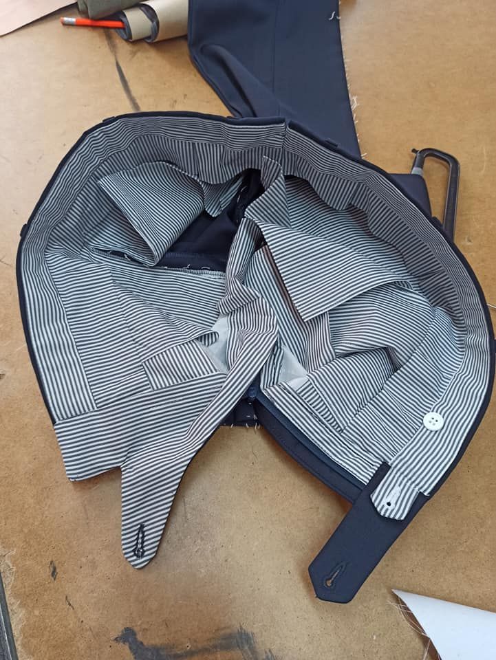 Le parti tagliate con precisione vengono affidate alle abili mani dei sarti altamente qualificati di ERREBIEMME, che lavorano con passione per assemblare ogni pantalone su misura con attenzione meticolosa ai dettagli. Ogni cucitura è eseguita con maestria, utilizzando tecniche artigianali tradizionali per garantire una vestibilità perfetta e una durata eccezionale.