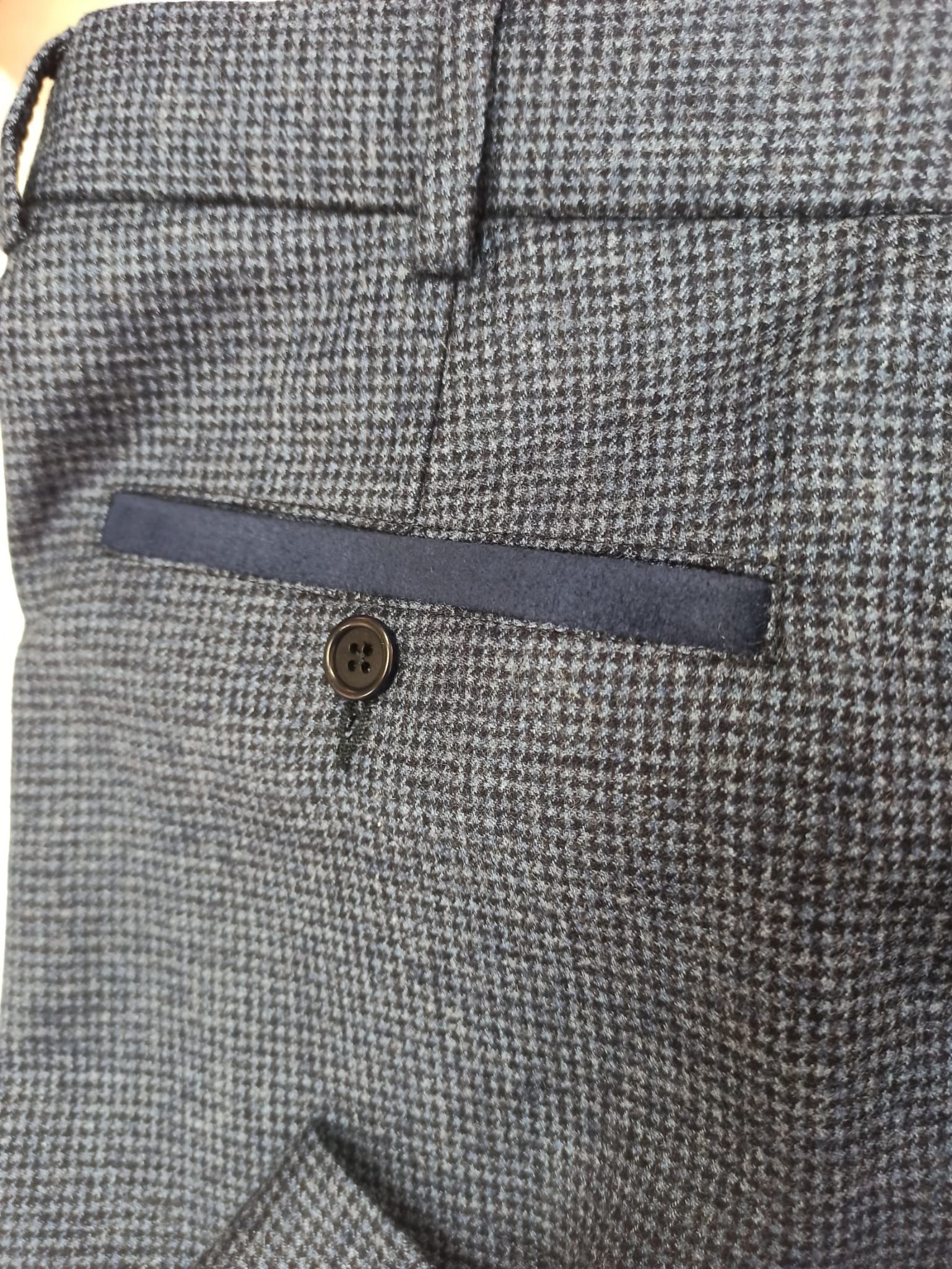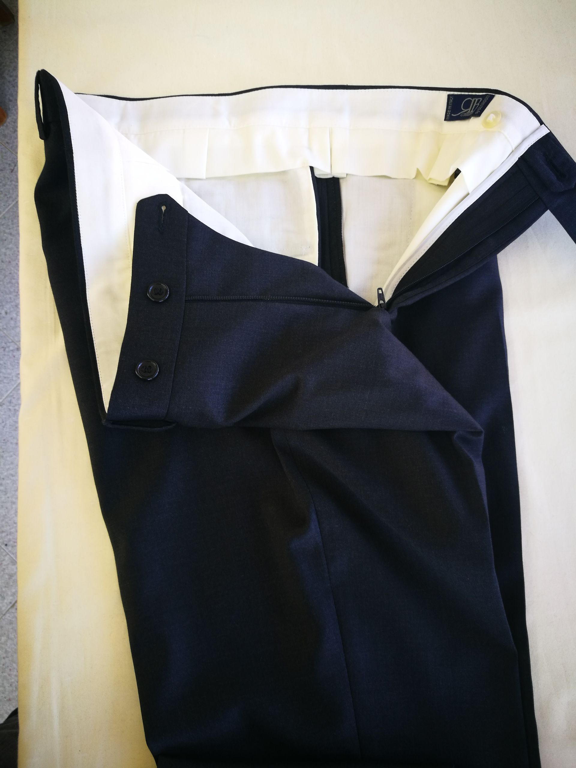La fase di confezione del capo comprende anche l'aggiunta di dettagli essenziali come bottoni, cerniere e passanti per cintura, tutti attentamente posizionati per garantire la funzionalità e l'estetica del pantalone. In questa fase, la maestria artigianale si fonde con la precisione tecnica per creare un capo su misura impeccabile.